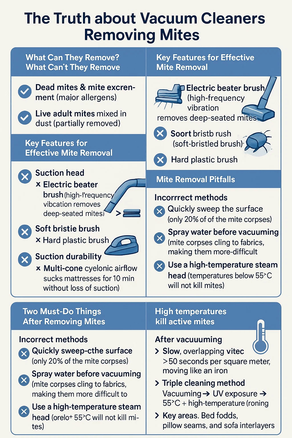 Cara yang salah: ** Sapu permukaan dengan cepat (hanya menghilangkan 20% bangkai tungau) ** Semprotkan air sebelum menyedot debu (mayat tungau menempel pada kain sehingga lebih sulit untuk disedot) ** Gunakan kepala uap bersuhu tinggi (suhu di bawah 55°C tidak akan membunuh tungau)